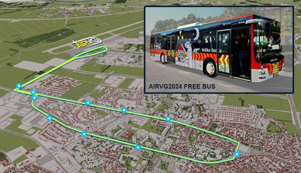 Besplatan AIRVG2024 shuttle bus vozi kružne linije po Velikoj Gorici s polascima svakih 15 minuta, od 11:30 do 18:30 sati, a zaustavlja se na označenim autobusnim stajalištima.