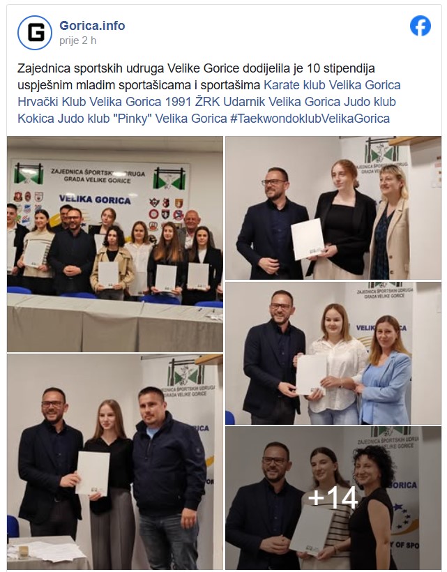 Dobitnici stipendije su Luna, Gojak, ŽRK Udarnik, Tena Pereković, Judo klub Kokica, Edita Zvonarić, Judo klub Pinky, Zara Hrvojić, Judo klub Kokica, Blago Šimić, Hrvački klub Velika Gorica 1991, Lucija Baković, Judo klub Kokica, Dora Habijančić, Taekwondo klub Velika Gorica, Ana Britvec, Judo klub Kokica, Jana Manojlović, Judo klub Kokica i Ema Jukić, Karate klub Velika Gorica.