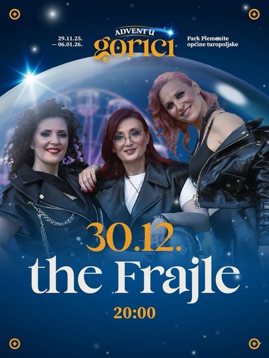 Završni glazbeni val počinje u utorak, 30. prosinca, kada na pozornicu Adventa u Gorici stižu neponovljive Frajle. Ove tri karizmatične glazbenice poznate su po svojim vokalnim interpretacijama, iznimnoj energiji i spoju različitih žanrova – od šansone i popa do tradicionalne glazbe.