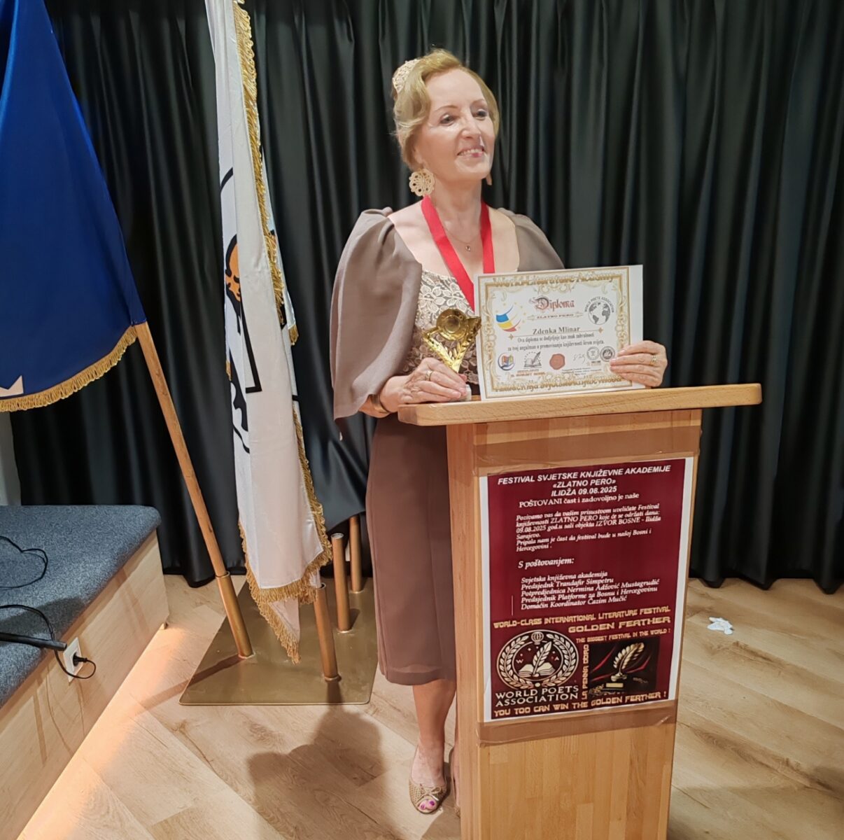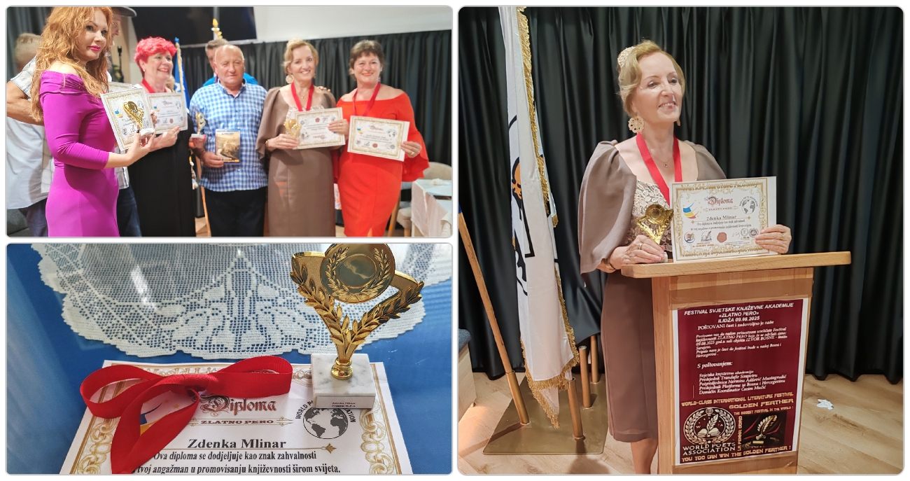 Gorička pjesnikinja Zdenka Mlinar dobila je još jedno vrijedno priznanje za svoj književni rad. Ovaj put pripala joj je nagrada “Zlatno pero”, pehar, medalja i diploma za angažiranost u promoviranju književnosti širom svijeta.
