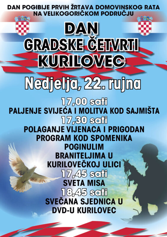 U Gradskoj četvrti Kurilovec pripremaju se za proslavu svog dana. U nedjelju, 22. rujna obilježavaju dan pogibije prvih žrtava Domovinskog rata na našem području i dan gradske četvrti. Program počinje u 17 sati polaganjem vijenaca, paljenjem svijeća i molitvom na Sajmištu. U 17.30 sati bit će polaganje vijenaca i prigodan program u Spomen parku u Kurilovcu kod spomenika poginulim braniteljima.