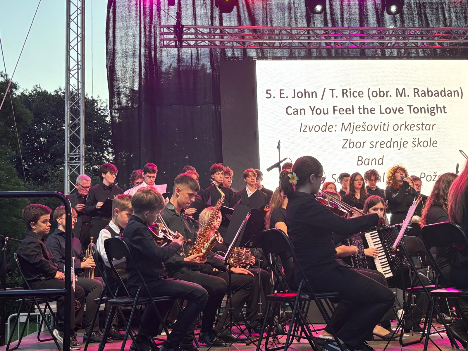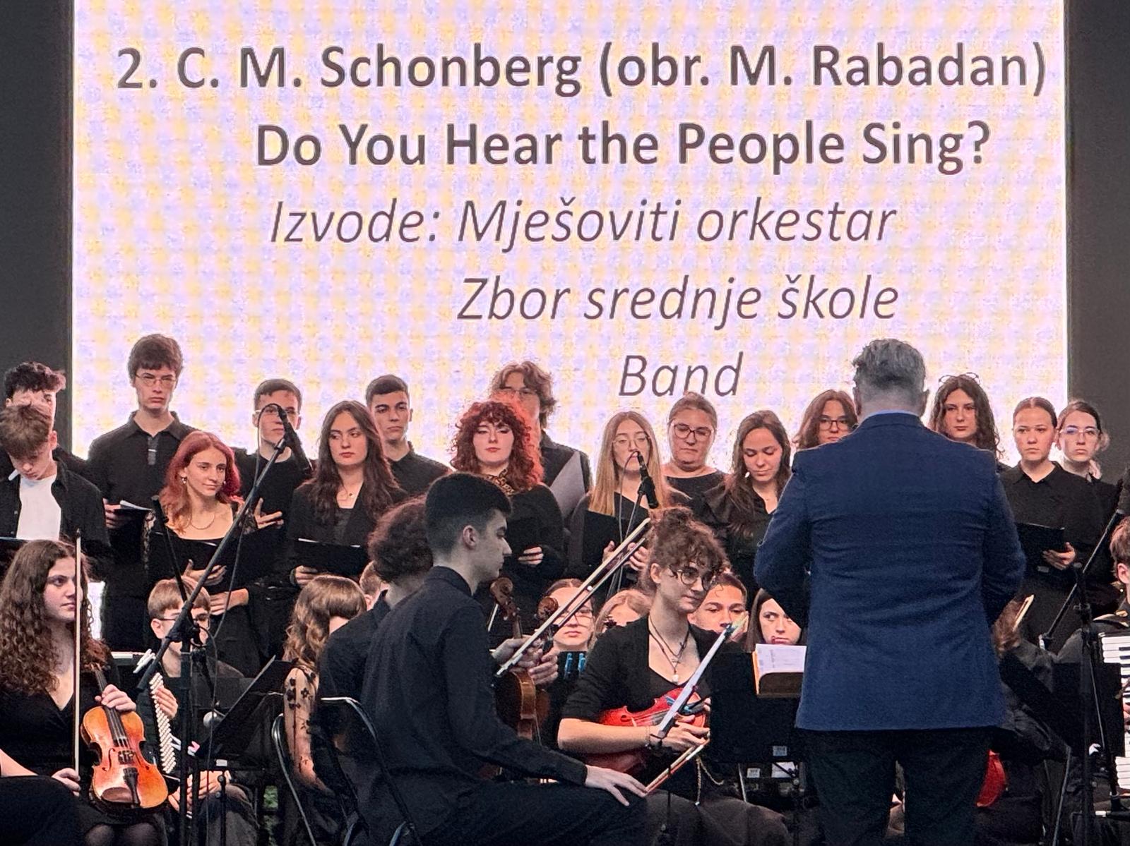 Koncert su započeli mješoviti orkestar i band uvertirom Gubec beg, nakon čega je na pozornicu došao i zbor srednje škole te su izveli skladbu „Do you hear the people sing?“