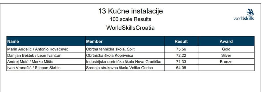 I Srednja strukovna škola imala je svoje predstavnike na ovom prestižnom natjecanju. Stjepan Skrbin i Ivan Vranešić osvojili su četvrto mjesto u kategoriji Kućne instalacije.