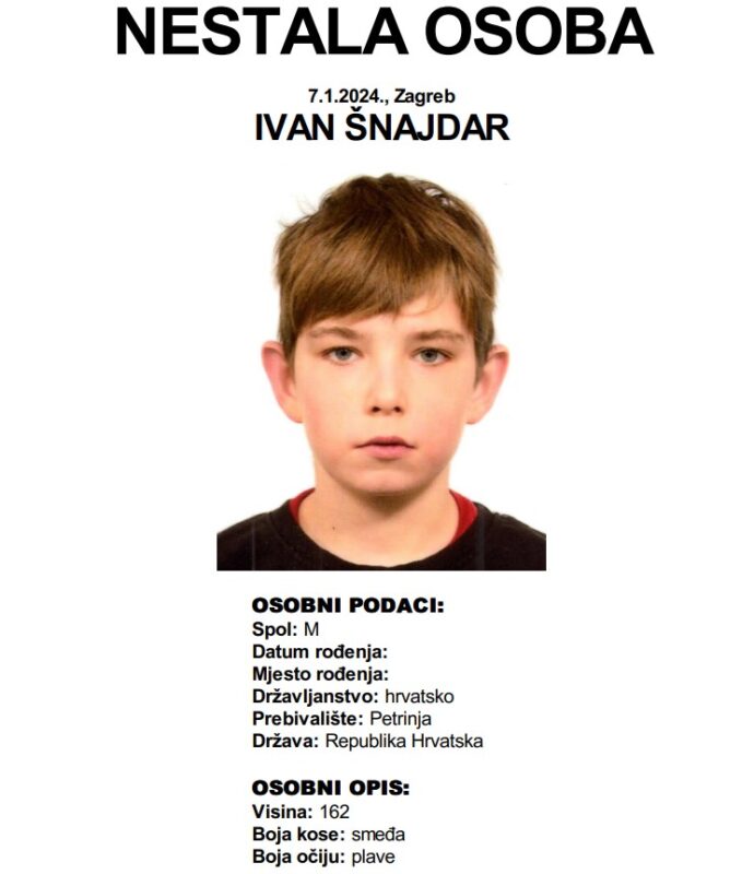 Tijekom dva dana u Zagrebu su nestala dvojica četrnaestogodišnjih dječaka. U nedjelju, 7. siječnja nestao je Ivan Šnajdar s adrese na Brezovičkoj cesti. Ivan je visok 162 centimetra, ima smeđu kosu i plave oči, a u trenutku nestanka nosio je trenirku i bijelu majicu.