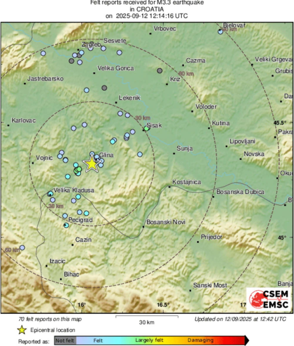 Potres jačine 3,3 stupnja po Richteru pogodio je danas iza 14 sati područje Gline, javlja Euromediteranski seizmološki centar (EMSC).