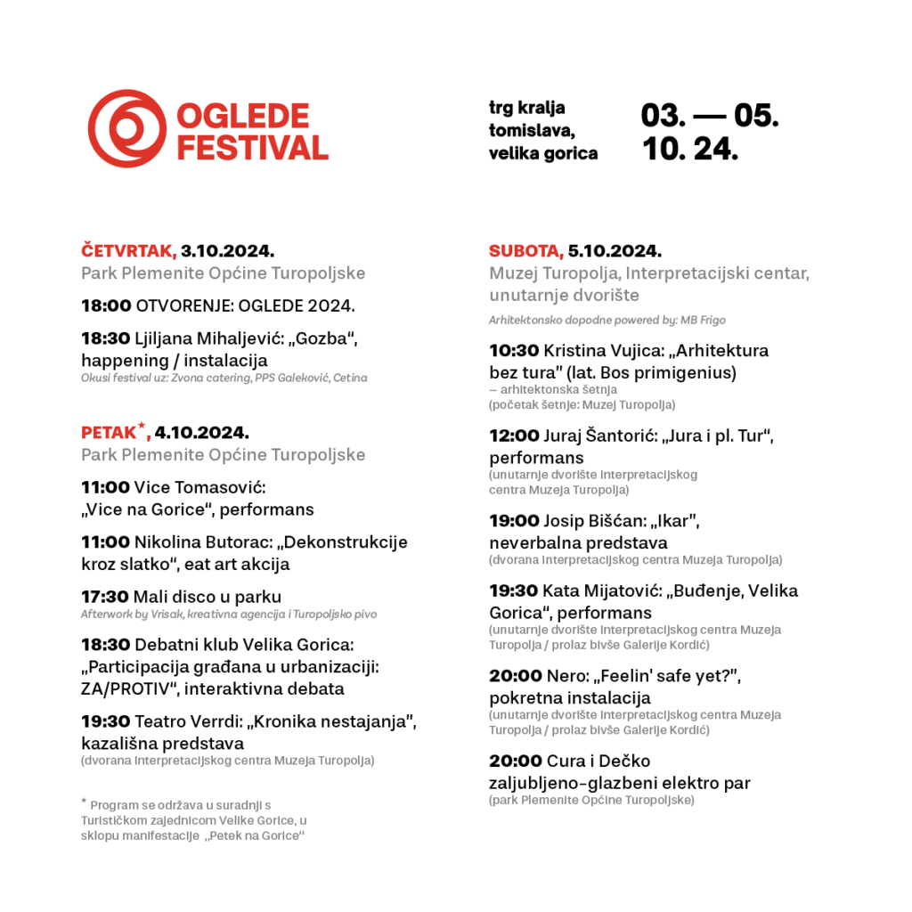 Drugo izdanje „Oglede“ festivala izvedbenih umjetnosti i suvremenih praksi otvara se u četvrtak, 3. listopada. Otvorenje festivala je u 18 sati u Parku plemenite općine Turopoljske, a pola sata kasnije počinje “Gozba” Ljiljane Mihaljević