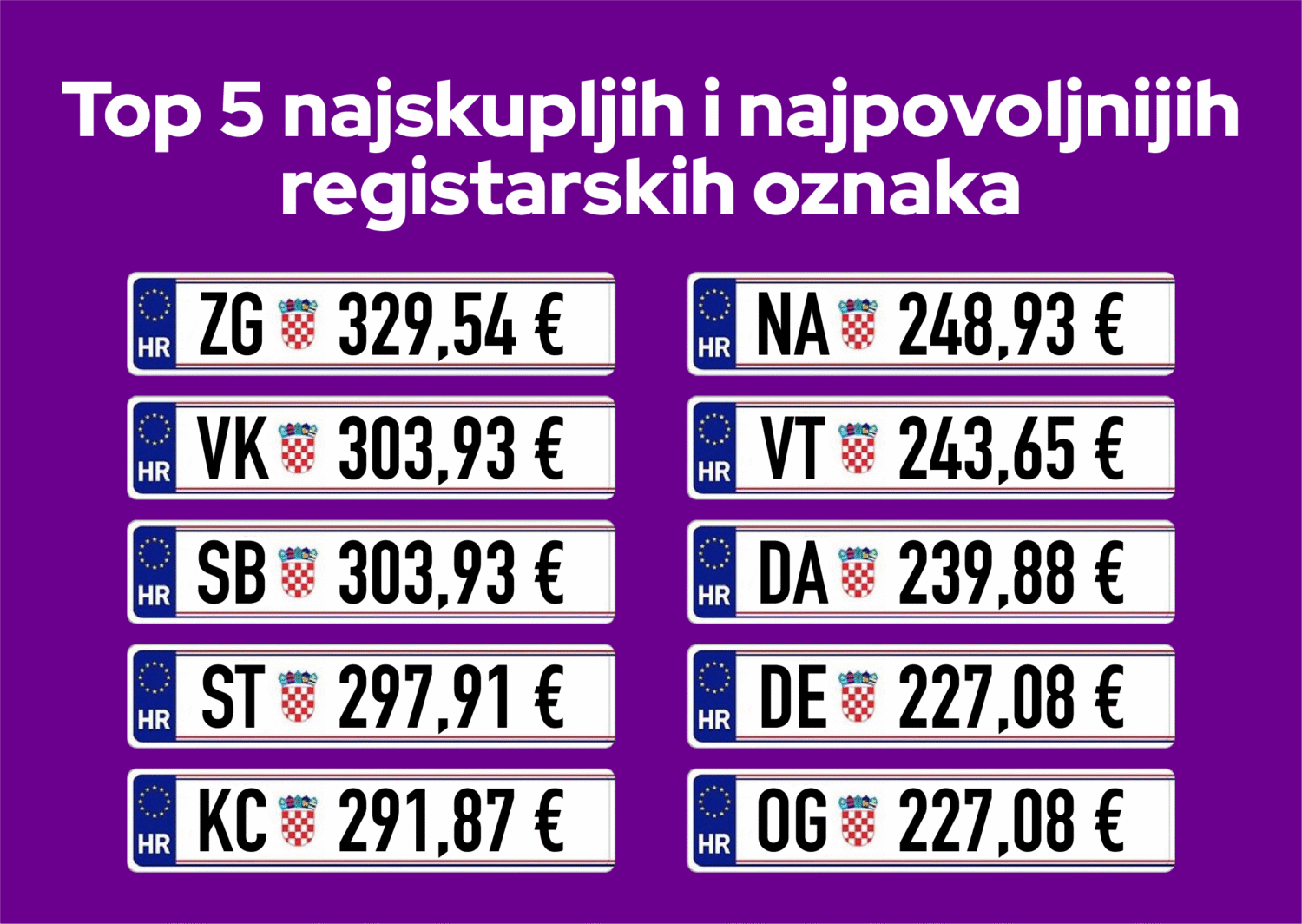 U nastavku donosimo pet najskupljih i pet najpovoljnijih registarskih oznaka prema rezultatima naše analize: