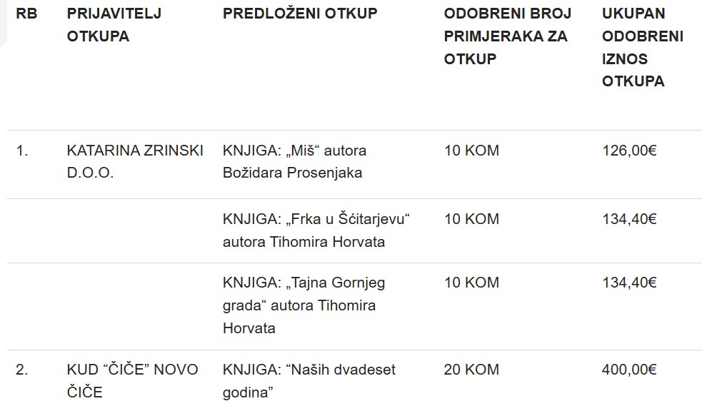 Grad Velika Gorica objavio je popis knjiga koje će otkupiti ove godine. Na popisu su knjige „Miš“ autora Božidara Prosenjaka, Frka u Šćitarjevu“ i „Tajna Gornjeg grada“ Tihomira Horvata te monografija KUD-a “ČIČE” NOVO ČIČE “Naših dvadeset godina”.